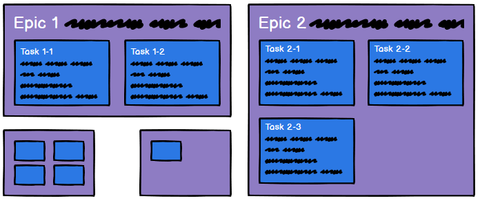 Task breakdown is an art-form. It’s hard to provide specific rules and is more of a gut feel once you have enough experience doing it. You can approach it from top-down (start with epics and add issues) or bottom-up (create all your tasks and then group them into epics). But basically, an epic is a larger bucket of work that contains issues (a has-a relationship). When is something an epic, when is something an issue, and how big do you make issues? A general rule of thumb: if something will take you longer than a morning or day to complete, then it’s too large to be one issue. From there, whether you make the issue an epic with detailed steps in child issues or separate the issue into two depends on the problem being solved and how you want to organize and describe the work. As I mentioned before, this is a guideline and let common sense rule in each situation.